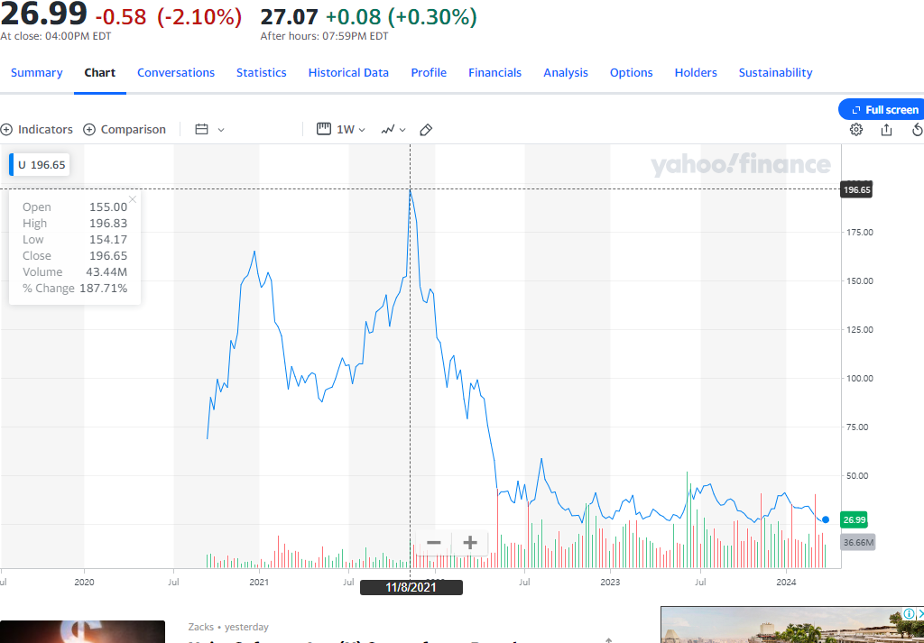 유니티 소프트웨어는 중장기적으로 미래 성장가치가 뛰어난 기업이라고 생각한다. 어떤 게임이든 유니티 엔진을 통해서 만들고, 그를 통해 얻는 수입도 점점 늘어나고 있다. 그렇기 때문에, 코로나 기간과, 금리가 급등하기 전 195USD 까지 찍었을 때는 그 주식의 가치가 끝도 없이 올라갈 것만 같았다.