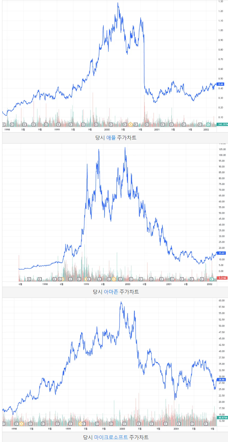 우리에게는 아픈 추억이 있다. 그것은 IT 버블이라고 하는 2000년도 초반에 IT 회사들의 주가가 8배 이상 폭등했다가 다시 3분의 1토막 또는 8분의 1토막이 났던 경험이다. 그 당시에는 너무나도 짧은 시간 강한 폭등장이 근거 없이 벌어졌다가, IT 회사들이 아직까지 실질적으로 수익이 나오지 않는다는 사실을 경험하고 주가가 폭락했다는 사실이다. 인터넷으로 세상이 바뀔 것이라는 예측으로 인해 실제 수익에 비해 주가가 폭등하기 시작했으며, 아직까지 인터넷 비즈니스로 인해 대부분의 기업들이 투자금은 늘어나는 반면 실질적으로 돈을 벌고 있는 회사들도 이익이 현재처럼 충분하게 내지 못하고 있는 상태였다. 그러므로, IT 버블까지는 아니지만, 상대적으로 빅테크 주가가 버블을 일으키고 있는 지금 시점에 이러한 위험을 충분히 인지하고 주식을 투자해야 한다는 사실을 알아야 한다.