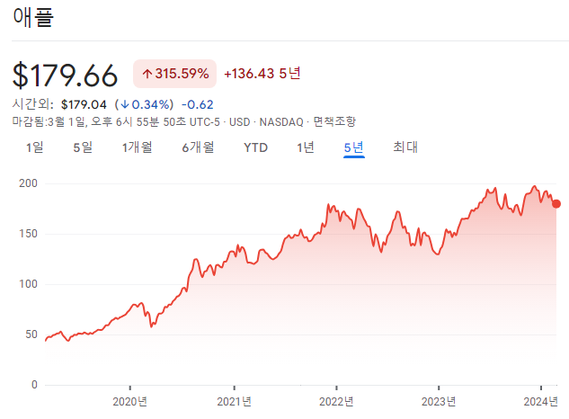 세계 1위 시가 총액의 회사임에도 불구하고, 5년간 보유하고 있었다면, 주식이 50usd 애서 3.2배가 올랐다. 실질적으로 세계에 대한 지배력을 형성하고, 다른 회사가 침입하기 어려운 애플 생태계를 구성하였으며, 관련한 부분에 대한 독자적인 지위를 유지하고 있기 때문에 아직까지도 마이크로 소프트와 더불어 세계에서 제일 돈을 잘버는 회사이다. 그러므로, 마이크로 소프트와 더불어 자기만의 지배권을 유지하고 있고, 장기적으로 이러한 아성이 흔들리지 않을 것으로 예측한다면, 애플에 투자하면 된다.
