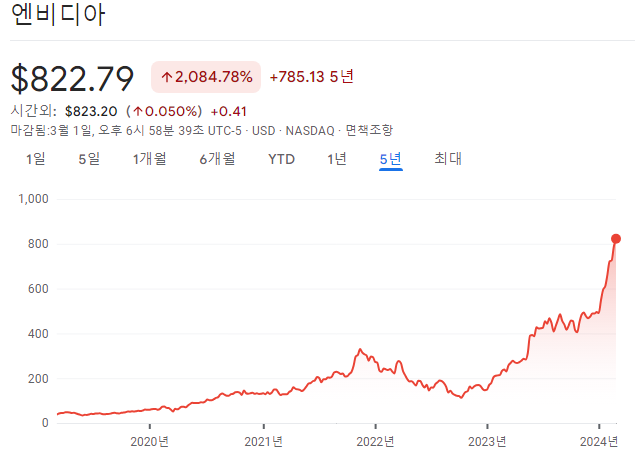 현재 AI로 가장 뜨고 있는 NVDA다. 이제 슬슬 고평가의 영역에 들어섰고, 해당 영역에서는 이제 기존 보유한 사람이 즐기는 영역이지, 새로 들어갈 종목은 아닐 것 같지만..... 한반 붐이 일고 실질적으로 수요가 있는 것을 확인한 이상, 버블이 더욱 발생할 수 있을 것으로 판단된다면.... 일부 엔비디아를 담아볼만 하다. 하지만 지금은 추가로 엔비디아를 매수하는 것은 이제 조심해야 할 시기라고 생각된다.
